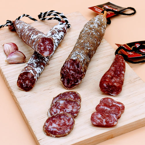 Una peça de fuet sense lactosa, una peça d'espetec sense lactosa i una peça de llonganissa de matança sense lactosa.
