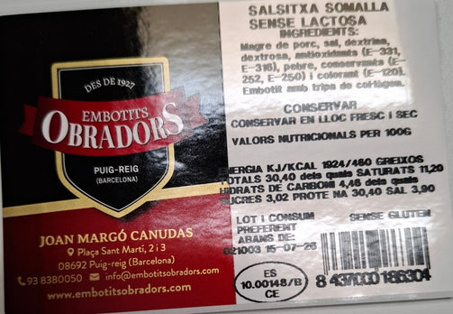 Magre de porc, sal, dextrina, dextrosa, antioxidants (E-331, E-316), pebre, conservants (E-252, E-250) i colorant (E-120).