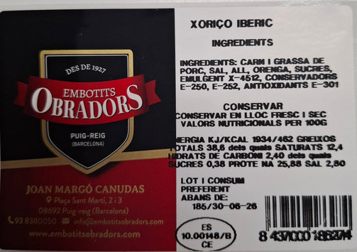 Magro y grasa de cerdo ibérico, sal, pimentón, LACTOSA, dextrosa, PROTEINA DE LA LECHE, ajo, orégano, conservantes (E-250, E-252), antioxidante (E-301) y colorante (E-124).