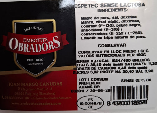 Espetec sin lactosa: Magro de cerdo, sal, dextrina blanca, citrato sodico, dextrosa, colorante (E-120), pimienta negra, antioxidante (E-316) y conservantes (E-252 y E-250). Embutido con tripa natural de cerdo.