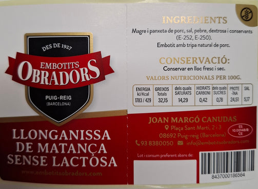 Longaniza de matanza sin lactosa: Magro de cerdo y panceta de cerdo, sal, pimienta, dextrosa y conservantes (E-252, E-250). Embutido con tripa natural de cerdo.