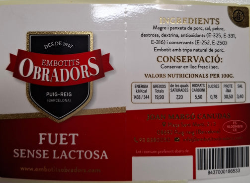 Fuet sin lactosa: Magro y panceta de cerdo, sal, pimienta, dextrosa, dextrina, antioxidantes (E-252, E-250). Embutido con tripa natural de cerdo.